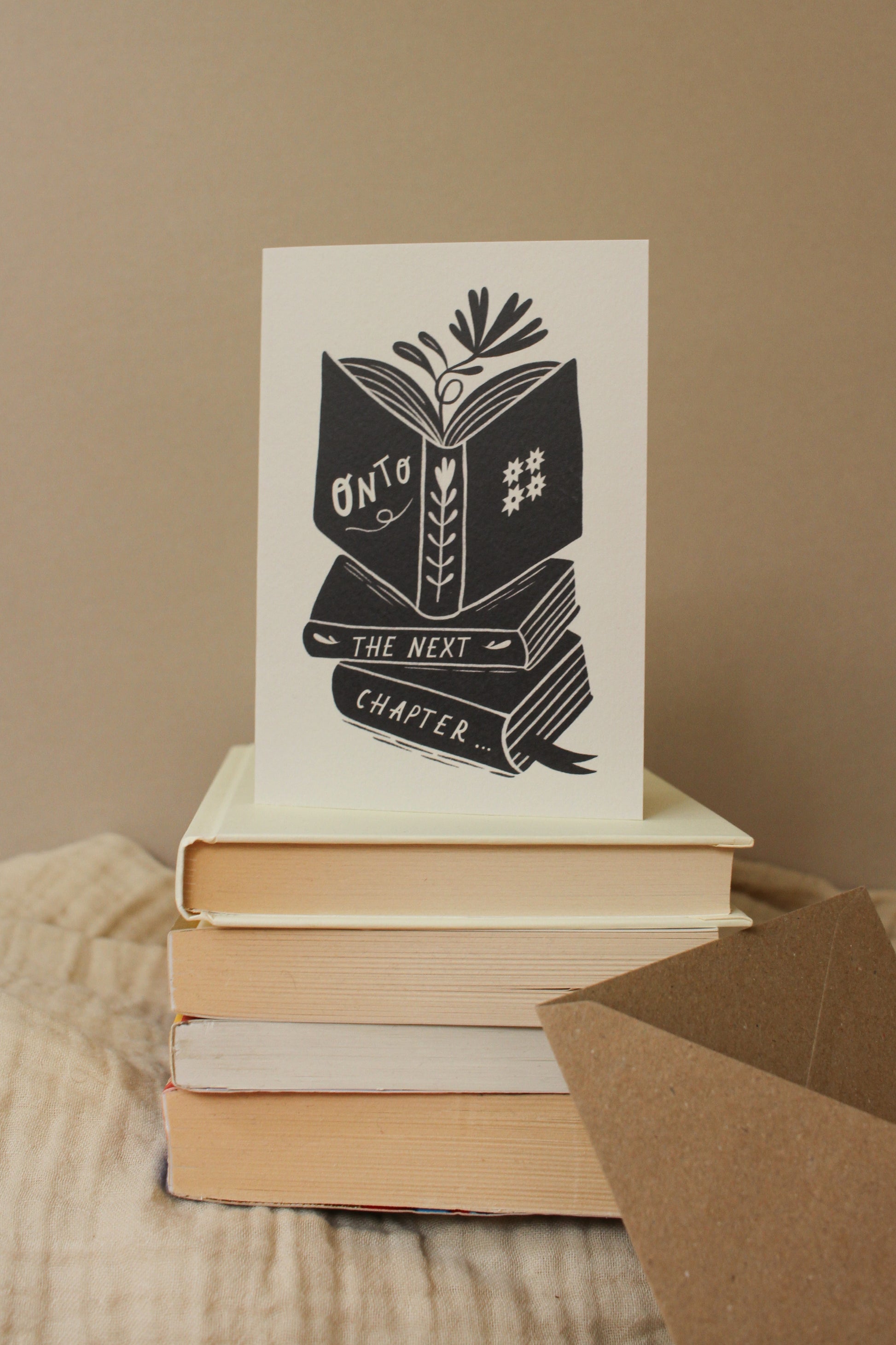 A thoughtful greeting card featuring a hand-drawn stack of books with the words 'Onto the Next Chapter'. Perfect for new beginnings, graduations, retirements or fresh starts.